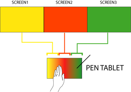 A pen tablet will be used to play and spread the animation into the 3 screens, like 3 little timelines.