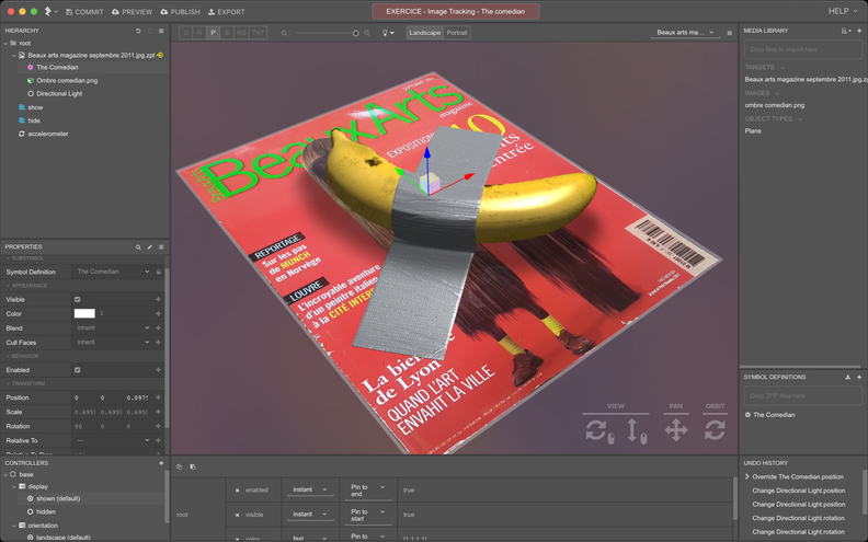 - L'éditeur Zapworks Studio est un logiciel plus complet qui permet de designer toute sorte d'experiences en réalité augmentée. Il permet d'intégrer des images, du son, des videos, des modèles 3d (texture, matériaux et lumières ) et de créer des scénarios avec ou sans code.