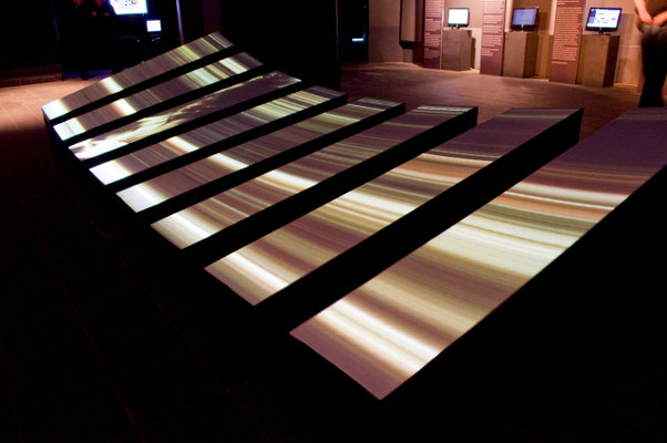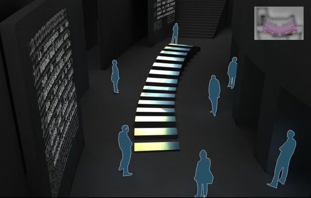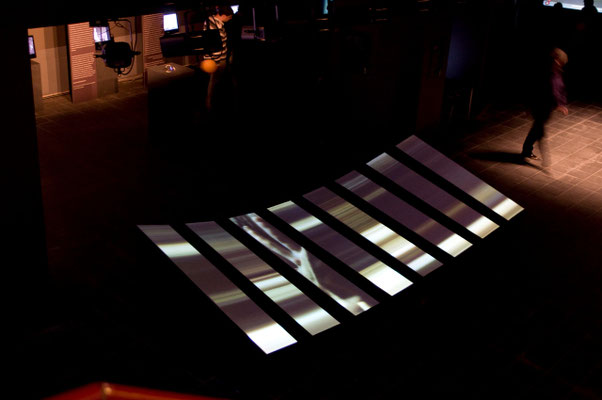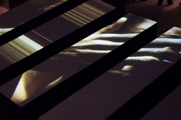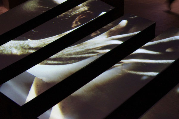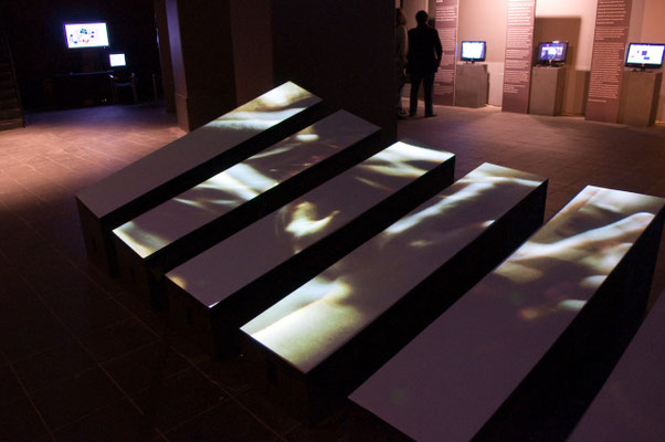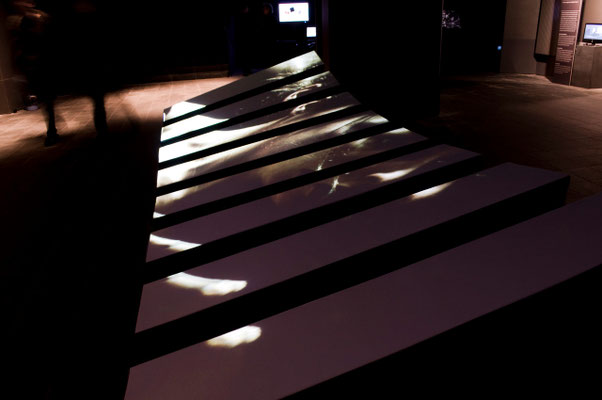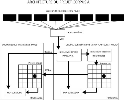 Le projet Corpus se situe en temps que réflexion sur un dispositif interactif qui, pour parler du corps, et à travers lui de l'être, s'organise lui même en corpus, ensemble d'éléments signifiants. Corpus-A est un dispositif doté de 8 éléments scénographiques autonomes. Offerts au public , ces éléments abritent sur leur dessus les projections de fragments visuels. L'oeuvre est offerte au regard du public, presque couchée mais se relevant au long d'une surface tendue abritant la représentation des corps. Son interactivité se révèle lorsque le public s'approche: Chaque bande perçoit la présence du visiteur, sa proximité et permet d'explorer une courte scène vidéo en jouant sur des notions spatiales et temporelles.