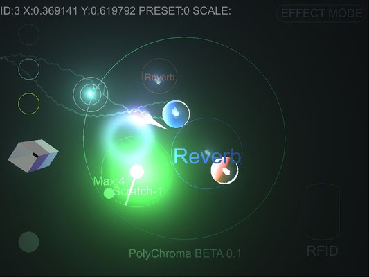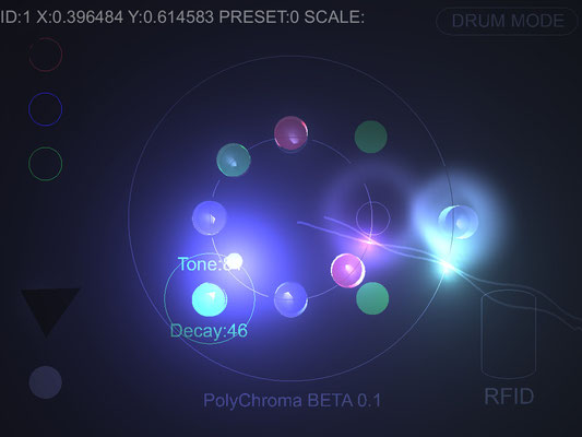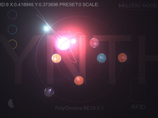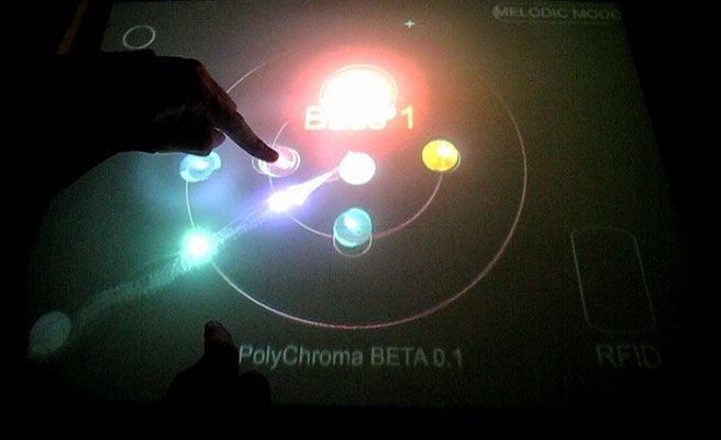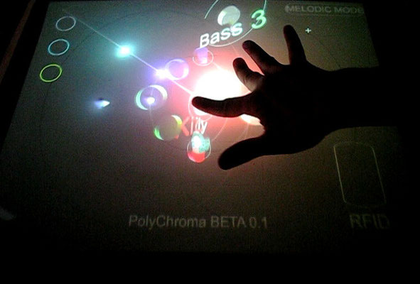 Polychroma est une recherche autour d'un instrument de musique adapté à la performance live. Il est issu d'une nouvelle manière d'aborder l'écriture basée sur un mode de représentation circulaire du temps. L'ajout de chaque pas du séquenceur permet de composer rapidement des motifs mélodiques ou de jouer avec des modèles physiques. consulter le document pdf