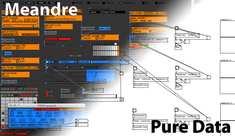 Méandre est un Meta-outil pour artistes, destiné à faciliter l'écriture de projets interactifs. Il se compose de gestionnaires d'événements permettant de scénariser l'interaction entre capteurs et médias. Il à été développé dans le but d'accompagner les pièces interactives sur lesquels j'ai travaillé avec le groupe de recherche ITR (Ensadlab) et Active Creative Design. Méandre est aujourd'hui un outils qui permet de faciliter l'apprentissage de l'environnement Pure Data sur lequel il repose, sans en modifier le paradigme.