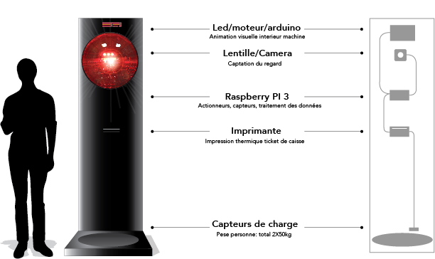 Trepascan est une caisse enregistreuse, sorte d’indice annonciateur d’un futur dystopique dans lequel la marchandisation du corps est une chose commune. A l’image de fictions tel que Soleil vert ou de faits historiques comme les camps d’extermination, le recours à l’exploitation du corps humain est le signe d’une perte de sens, où tout humanisme tend à disparaître. Le recours à la fiction et à la dimension comique est dans ce sens une façon non de minimiser des événements tragiques mais à relever l’absurdité de ce postulat. Trepascan, à comprendre comme Trépas – scanner , est un dispositif minimal mais ludique où le spectateur, se retrouve scanné (pesé), et reçoit un ticket indiquant tous les éléments/produits pouvant être fait à partir de son corps . Laissant ensuite à l’imaginaire tous les indices menant à reconstituer l’univers auquel appartient la machine. Nous vivons déjà dans une société où les individus, sont scannés, géolocalisés, inventoriés, ciblés, parfois même au profit de notre propre divertissement (réseaux sociaux, applications photo, jeux etc). C’est dans cet esprit que nous imaginons un monde courant à sa propre perte et où l’humain n’est plus qu’un bien consommable.